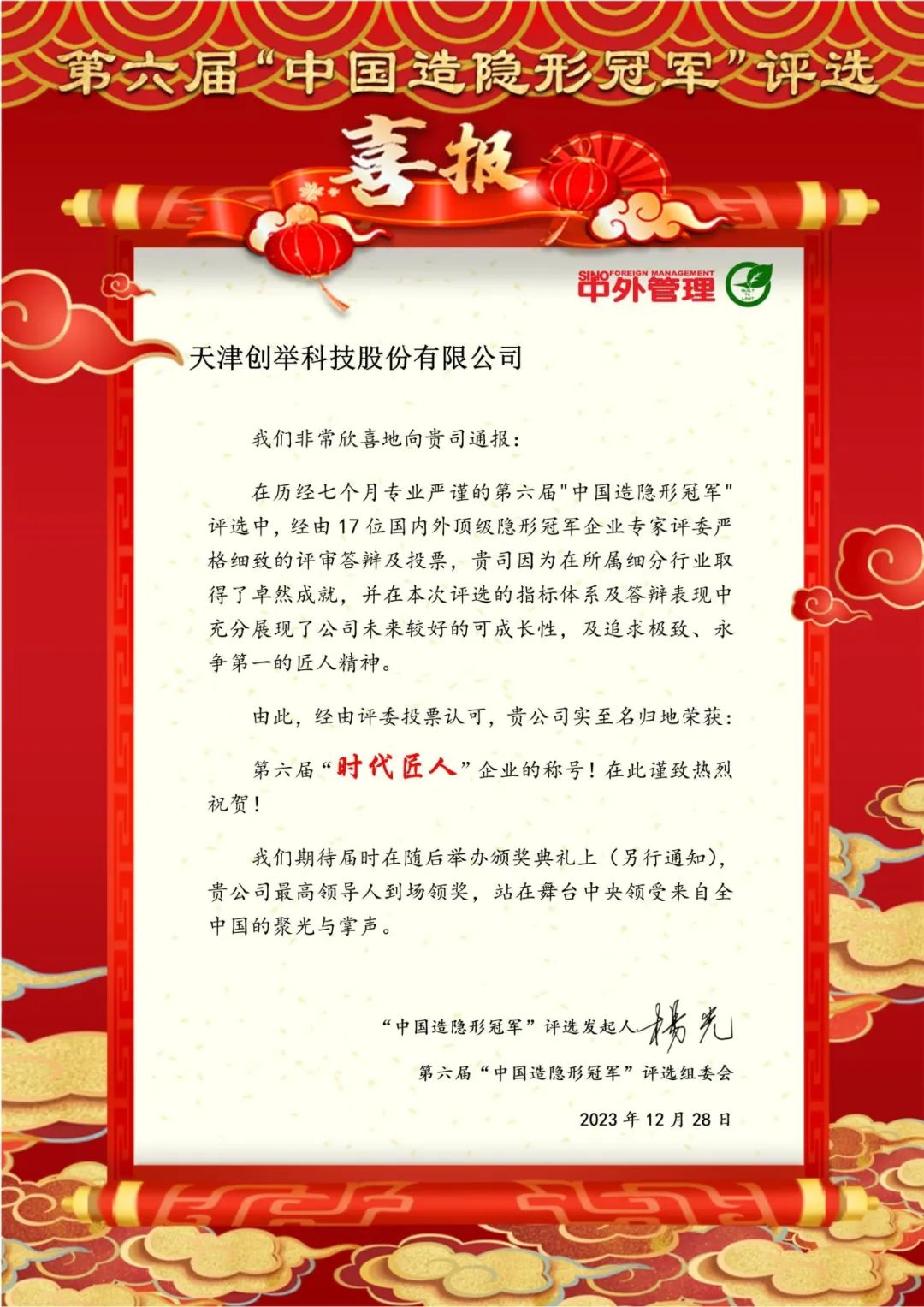 經(jīng)過18位國內(nèi)外頂級企業(yè)實戰(zhàn)派專家、著名商學院院長、投資機構(gòu)、媒體等多方嚴謹細致評定,天津市創(chuàng)舉科技股份有限公司榮獲“時代匠人”企業(yè)稱號。